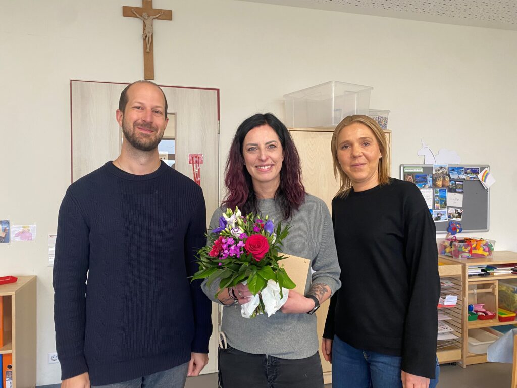 Herr Pfarrer Kleinle und die Kita – Leitung, Frau Leopold gratulieren ihr herzlich zur erfolgreich abgeschlossenen Weiterbildung zur pädagogischen Fachkraft. Für ihren weiteren beruflichen Weg als Gruppenleitung in unserer Kita wünschen wir ihr weiterhin viel Freude und Gottes Segen.